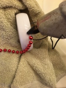 Using a hot glue gun, run about a 1-inch length of hot glue along the upper, outside edge of the puck light. IMPORTANT: Make sure that the hot glue does not drip down more than a width of about 1/4th inch. You do NOT want to glue to get into the screw-cap mechanism you turn to get to the batteries. Work fast to fasten each bead length to the hot glue, then wait until that grouping of beads and glue hardens before you apply another 1-inch length to set in place your next few bead lengths. It is best to work a short distance at a time because if you are not careful, the glue drips downward and may seal the screw-cap mechanism shut. Note: I prop the puck light on its side by wrapping a towel or other piece of materials around it, as I work.