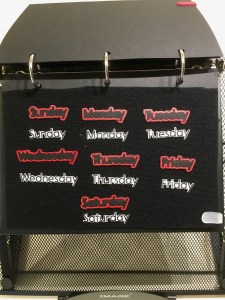 For the pages, I cut 8 pages out of heavy, black card stock to fit the notebook and punched the 3 holes. Pages 1-7 are for the days of the week with Journal images and page 8 was used as a “home” for the bubbled words. Using the Hook and Loop compatible fabric, I cut rectangles to fit each page, cutting the fabric about ½ inch to ¾ inch narrower than the page, to accommodate the 3 punched holes.