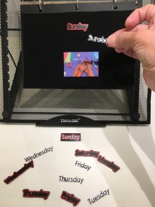 To create this activity, you will need to think about your child’s or student’s daily activities. Next, download an image, take a photograph or locate an image of something that represents each activity. For example, if on Monday, your child or student goes to swimming lessons in the morning, then after lunch might look through books, then later on that same day, helps to fold clean laundry, you might collect images of a pair of swim goggles, a shelf holding books, and a laundry basket. Print or cut out the images and attach them to small rectangles (approx. 2” X 3” in size) of heavy card stock or tag board. If you print the image from a color printer, use 8.5” X 11” label sheets so you can peel off the backing and stick each image right on the tag board rectangle. Attach the Loop side of Hook and Loop self-adhesive tape to the backside of the images, if you plan to use Hook and Loop pages. See photo below.