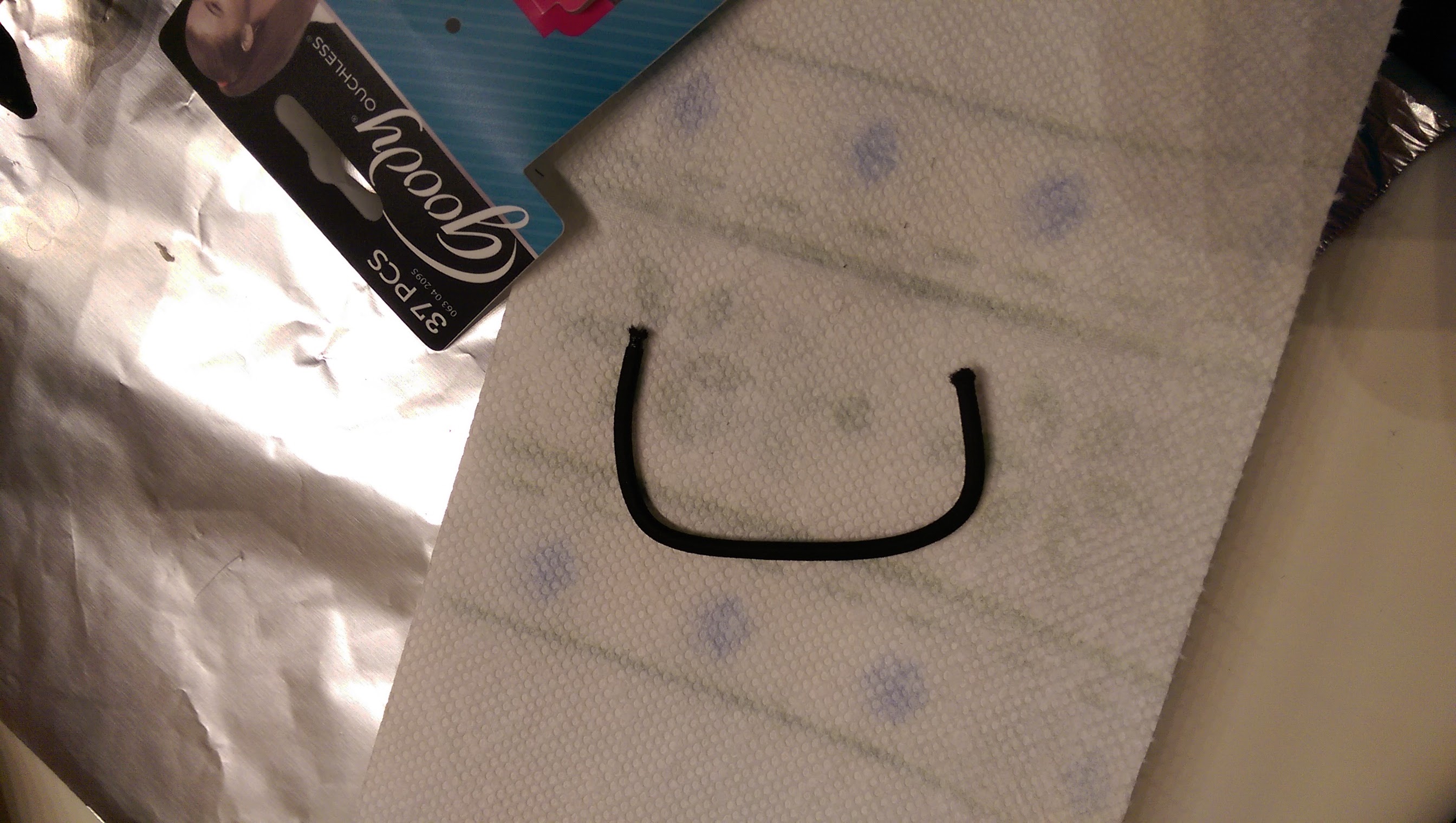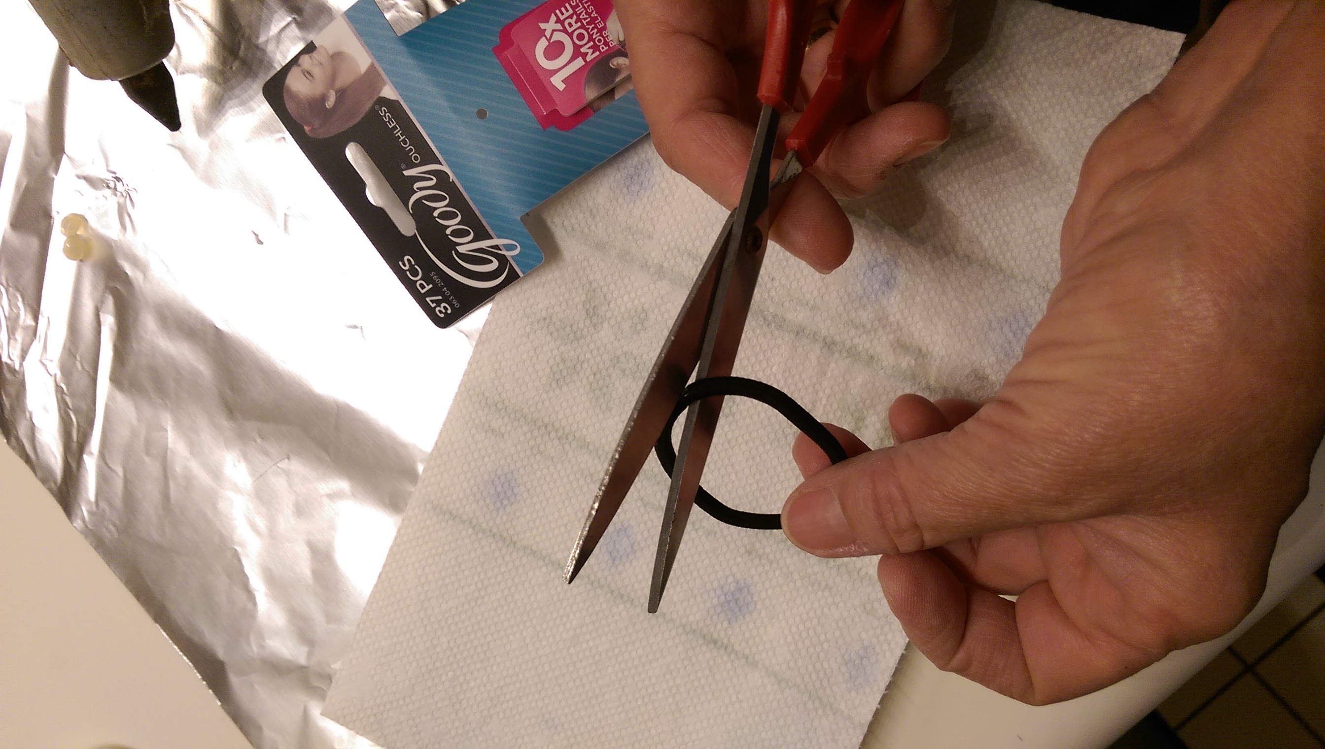 First, cut a Goody Elastic Hairband so that it is a single elastic length.