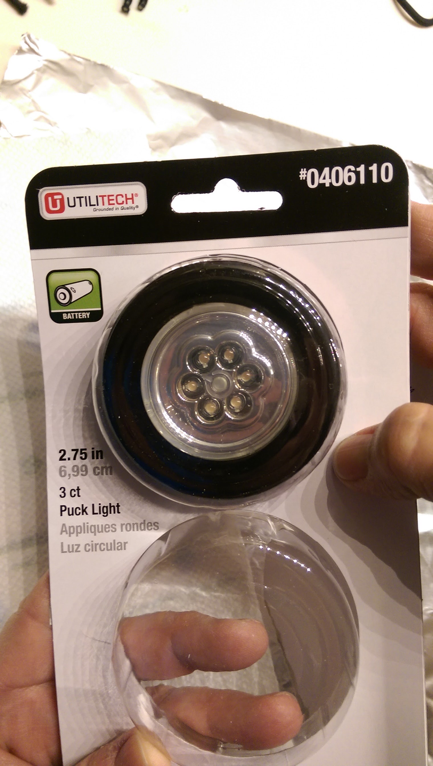 Use a black, battery operated puck light (it is very important to use a puck light that is very bright). This brand comes from Lowes Hardware.
