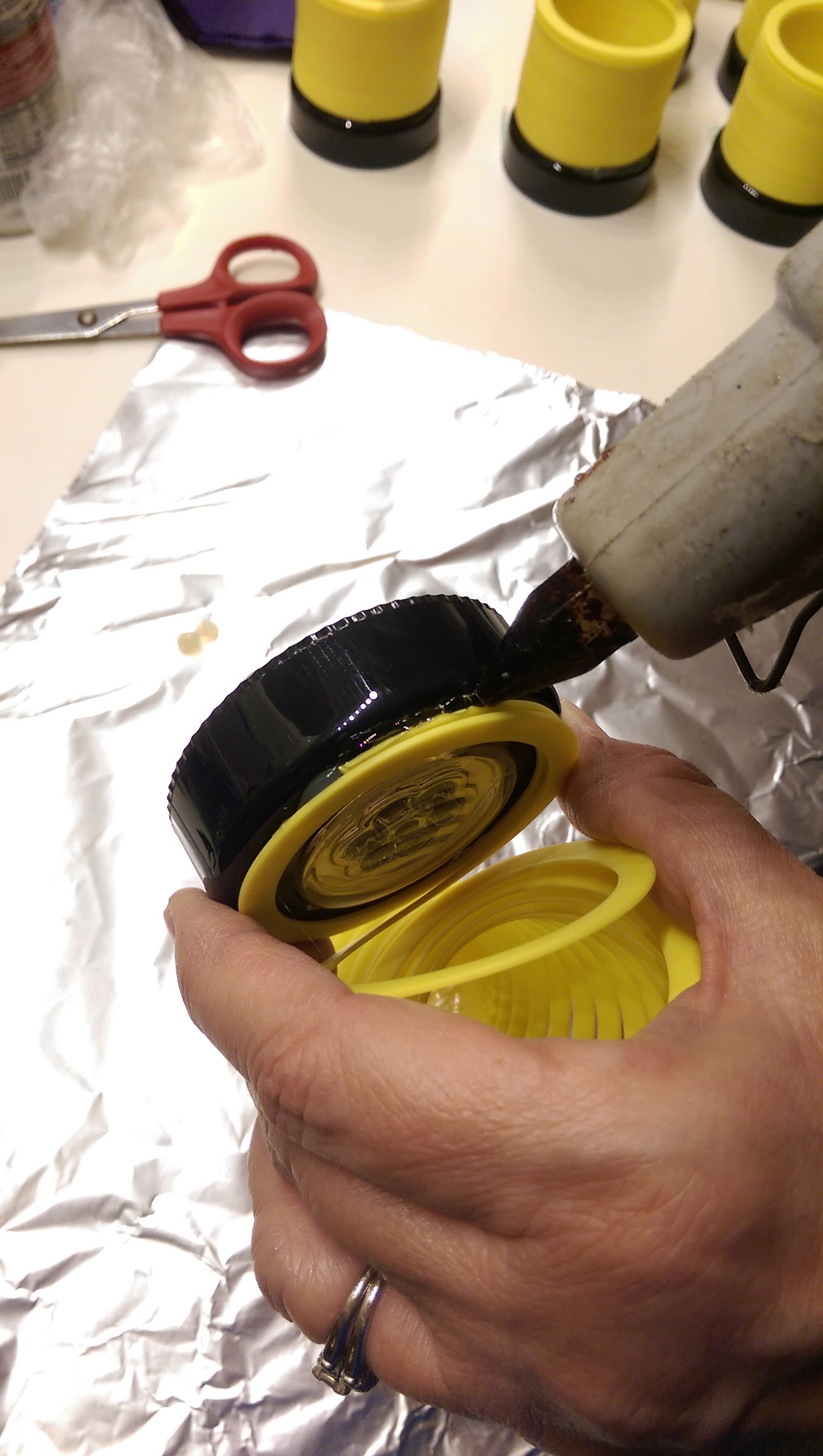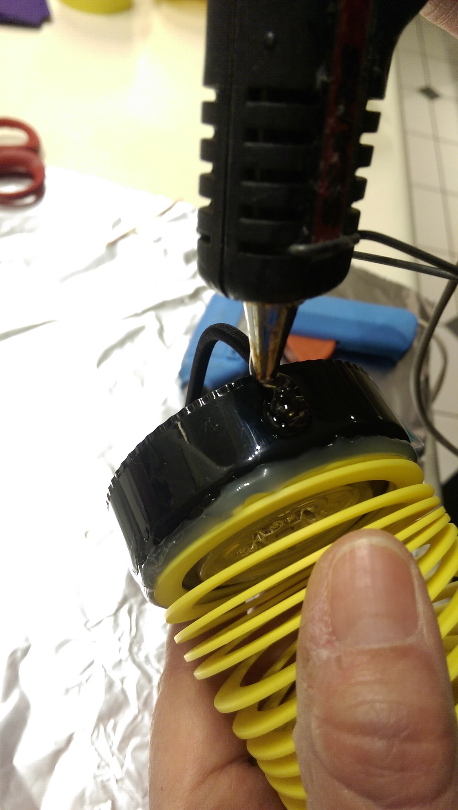 Once the thin layer of glue is dry, run another line of hot glue along the outer edge to make a solid seal between the Slinky and puck light.