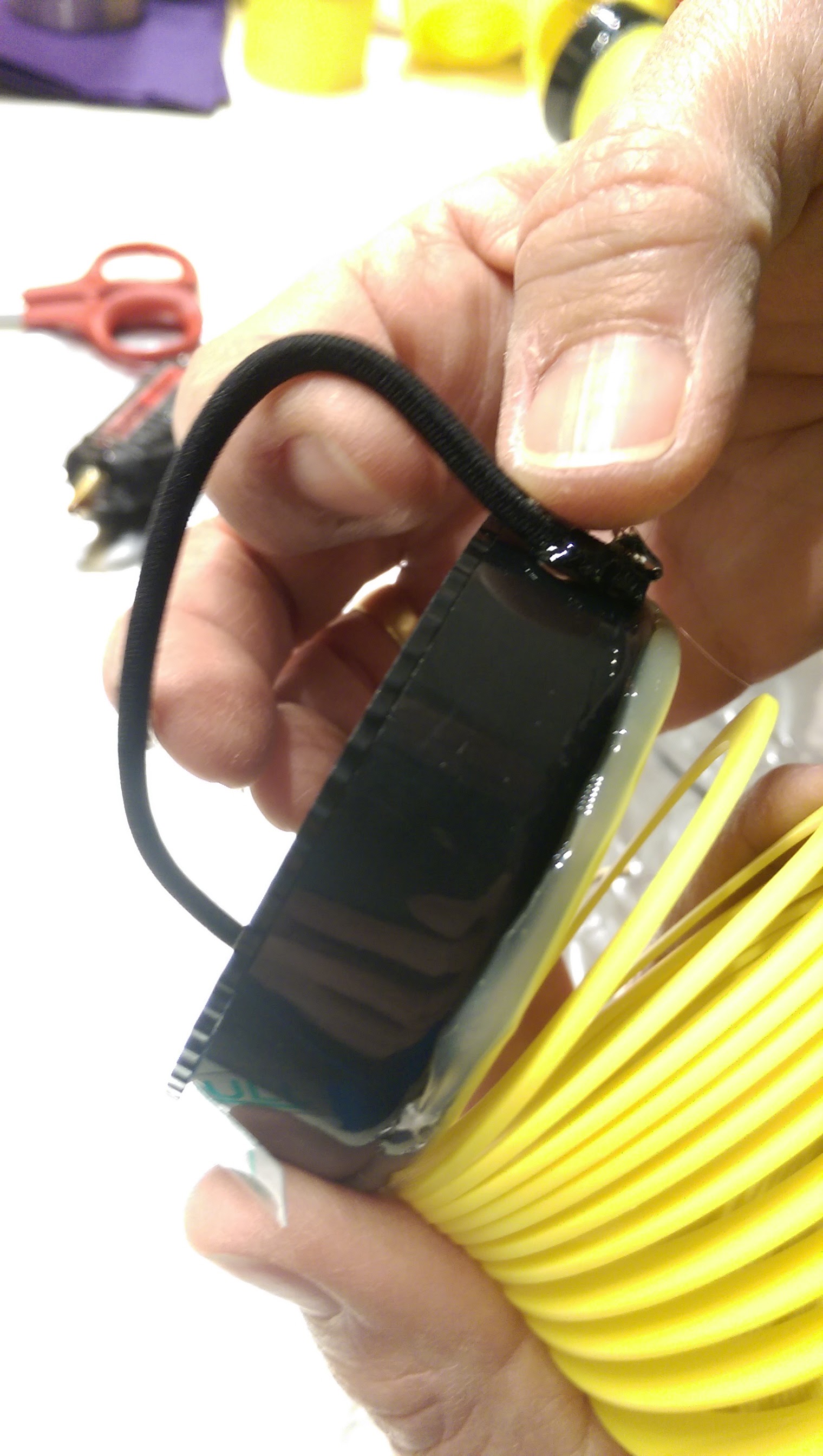 This is the final product. An “S-biner” (by Nite Ize) can also be attached to the elastic band to hang this device, for example, in a CVI Den.