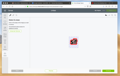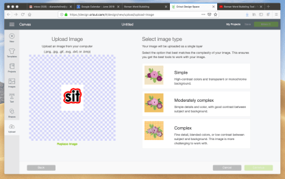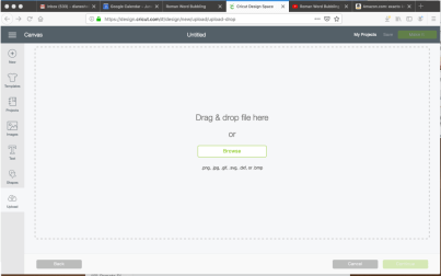 Locate the image of the bubbled word you saved in your desktop folder and drag it over to where it says, “Drag & drop file here”. Note that the Cricut program accepts .png, .jpg, .gif, .svg, .dxf, or .bmp images. Once you have dragged and dropped the image, the screen will change to this;