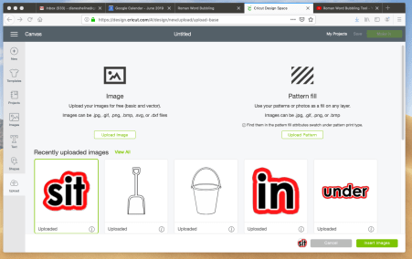 - Now we are back to our recently uploaded images page. Click on your uploaded bubbled word (mine is “sit”), and then once outlined in green, click on “Insert Images”.