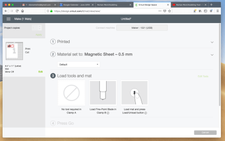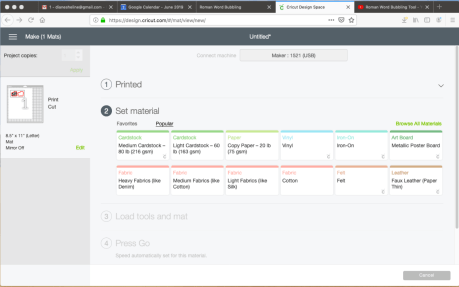 You should have already set your material, now you need to click on the type of material you are running through the Cricut so the machine knows how deep to make the cut. Since we will be cutting magnetic paper, we can go to the right side of the screen and click on “Browse All Materials”. The very last category to look through is “Other”. Under “Other”, there is a choice of Magnetic Sheet – 0.5 mm or Magnetic Sheet – 0.6 mm. If your magnetic paper is 0.5 mm or 0.6 mm in thickness, click on the appropriate one and then on “Continue”. However, I use Avery brand Printable Magnetic Sheets and when I click on 0.5 mm, the cut goes not only through the magnetic sheet, but also slightly into the mat. Therefore, I click on “Cereal Box” weight (in the “Browse All Materials” category) and then click on “Done”. “Cereal Box” thickness seems to work well without leaving cut marks on the mat, but you may have to cut twice or choose a different weight material. Your screen should now look like this.