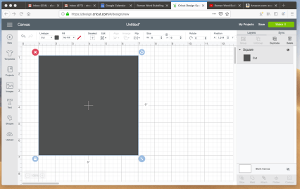 20. To make a solid black puzzle-like shape, start clicking on “New Project” and follow the same steps, uploading again either the same image or a new image, but at step #5, where you have the choice to either save the image as a “Print then Cut” image or as a “Cut image”, making certain that the, “Save as a Cut image” is outlined in green (as your choice), then click on “Save”. Now click on “Shapes” (in the left side column). Next click on “Square” and a small square will pop up on your Canvas. I expand mine to 6” X 6” in size.