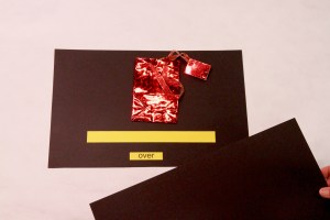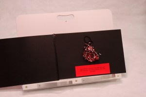 By sharing these books, I hope to spark ideas of subject matter and literacy presentation that might work well for your student. For example, your student or child might be just beginning to use vision and happens to have a special, favorite target. Instead of using the red mylar gift bag I use in the first example, you could swap that out and use your student’s or child’s favorite target (or a representative bit of the favorite target), on the same black paper pages, with “Page Fluffers”, no print, one target to each viewing page or array.