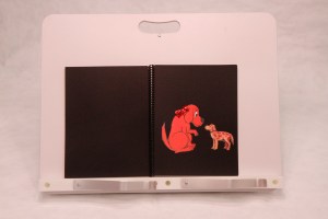 I then took one of the 3 books, and started to cut it apart, mainly focusing on cutting out Clifford only. I created a book about Clifford doing various things with little or no extra details. In each picture of Clifford, I glued on a red, mylar, ribbon-like “collar”, using the same ribbon that my student was familiar with.