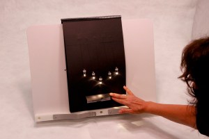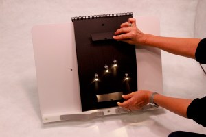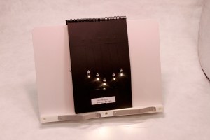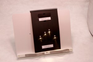 My book, “Five Little Lights” was created for a student who visually functions in Phase II and who attends well to lighted targets or targets that are back lit. I present this book on a large book stand so that the book can stand upright. For photographic purposes, a white book stand was used in the photos, but it is recommended that you use a black book stand with a black Invisiboard behind, which will reduce the environmental visual complexity and/or visual complexity in the array. I also often turn down the room lights, so that the target lights in this book stand out more clearly.