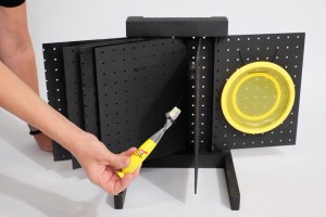 It will be important to set up an Invisiboard (or other similar black backdrop) behind the Pegboard Book, to eliminate distant “visual clutter” which might interfere with looking toward/at the Pegboard Book. This also has the added benefit, as noted above, of making the holes in the pegboard “disappear”.