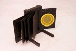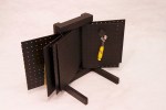 It is made from 1/8th inch thick pegboard, spray painted a flat black. The “pages” in this version are 9”X12” and are relatively lightweight and easy to turn. The “spine” and “binding” are also spray painted black so that each page acts as a Window Card or occluder, making each mounted target stand out. It is important to note that for photographic purposes and for the viewer to see how this is made, the photographs were taken with the book in front of a white background, which makes the pegboard holes stand out. When using this book with a student, the book should sit on a black table or black mat and an Invisiboard should be set up behind the book to eliminate the visual distractions of the holes.