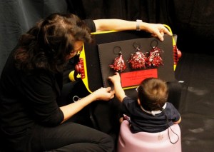 This child also benefited from movement, which was provided in part by the reflective quality of the red mylar, in addition to the physical movement of the bag itself. Keeping the bag separate from the page, we used Velcro again (on the page and on the back side of the bag), and as the story was told, we brought the bag in from the child’s preferred side, slowly moving it into position and attaching it onto the designated spot on the page.