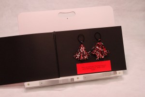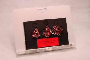 It is easy to make miniature mylar pom poms by breaking apart a full sized Pom Pom and cutting shorter lengths of the mylar strands, binding them into bundles and creating a smaller version of the student’s favored target. In this book pictured, I used a combination of red and silver strands, but it can easily be created with all red or all yellow, or any color that is preferred by the child. Any slight movement of the page causes movement of the light weight individual strands of mylar and the reflective quality of the Mylar also draws visual attention.
